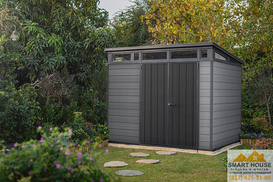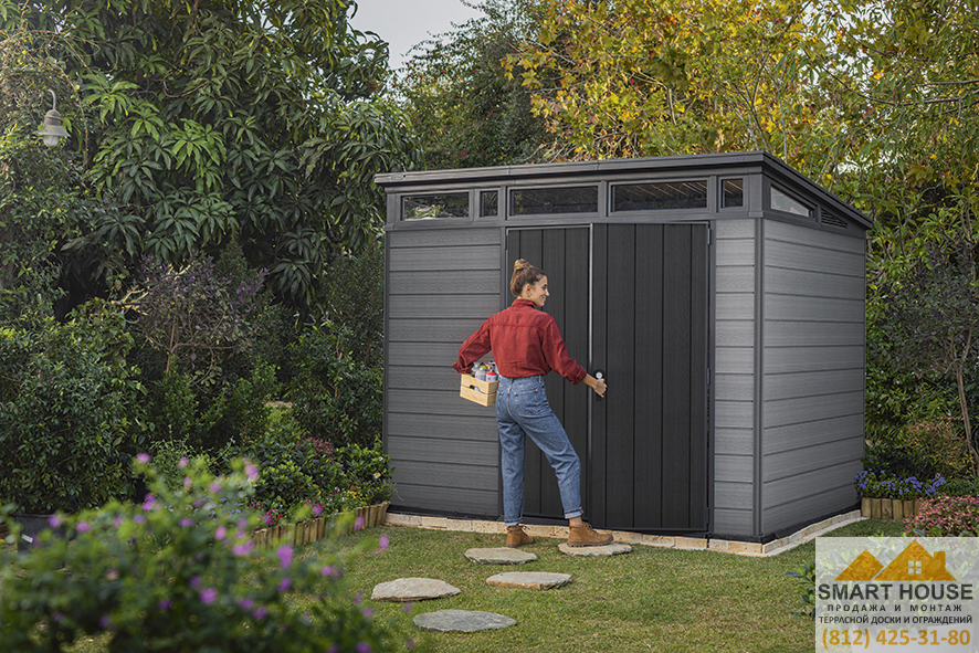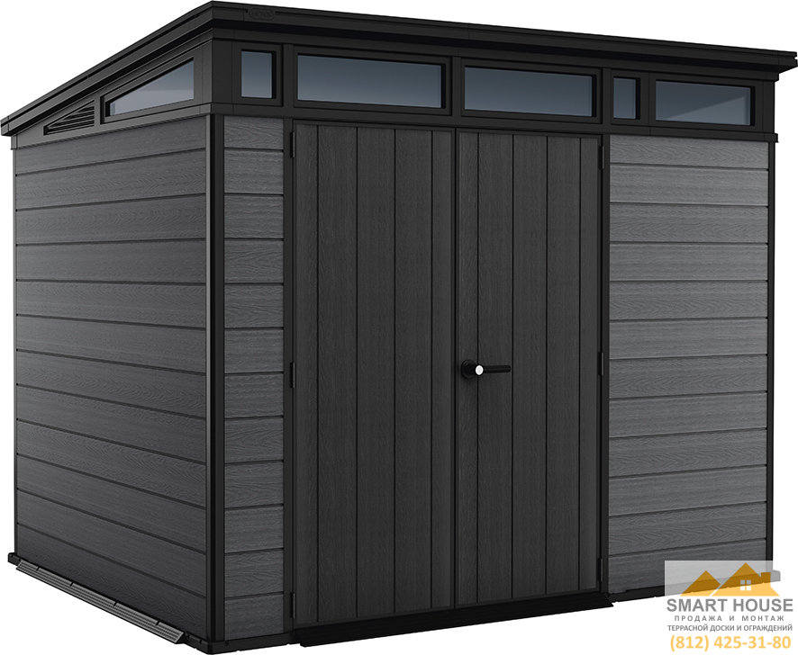 Cortina 9x7 - Хозяйственный домик Cortina современен с любой точки зрения. Односкатная крыша, встроенные с трех сторон кровельные фонари и простые двустворчатые двери подчеркивают его оригинальный современный характер. Двухслойные стены изготовлены из очень прочного инновационного композитного материала "EvotechTM". Фактура поверхности поразительно отражает натуральный древесный рисунок. Этот необычайно прочный домик для инструментов устойчив к погодным условиям и ультрафиолетовым лучам и не нуждается в уходе - он не ржавеет, не гниет и не шелушится. Домик легко содержать в чистоте.