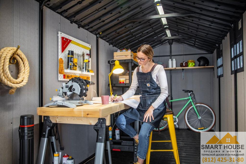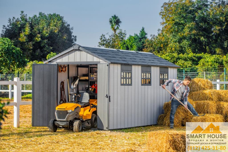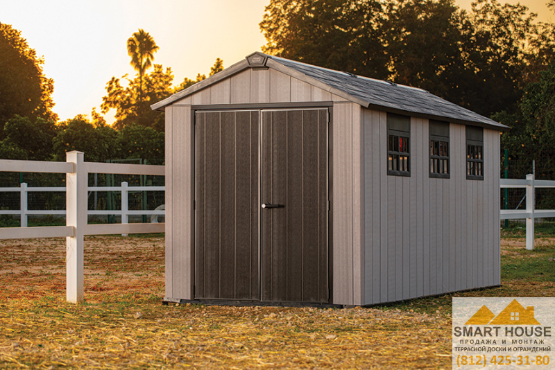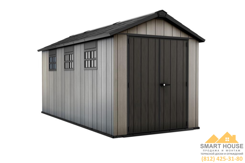 Пластиковый хозблок Oakland 7515, продуманная, усиленная металлом конструкция понравится тем, кто предпочитает соединение функциональности и хорошего стиля. Оптимальная емкость, двустворчатые двери, толстые, двойные панели и солидная крыша - все это очень важные и практичные преимущества изделия. Бокс отлично вписывается в садовое пространство, а дополнительным преимуществом является опция изменения цвета путем окрашивания панелей в нужный Вам цвет. Внутри с успехом поместятся крупные садовые инструменты, такие как самоходные газонокосилки, гриль, садовая мебель и ряд других садовых аксессуаров. Стены сарая могут быть окрашены основанной на воде акриловой краской для внешнего использования, для этого рекомендуется использовать валик. Следует помнить, что окраска требует обслуживания и через какое-то время может потребоваться перекрашивание.