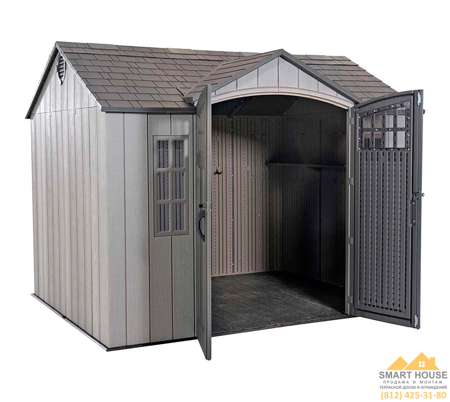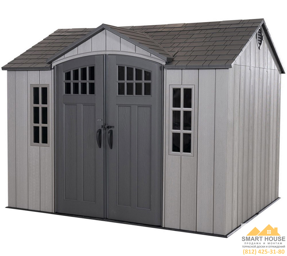 Сарай WoodLook 10х8 идеально удовлетворит Ваши потребности в хранении. Сделан сарай из двухслойного пластика высокой прочности, армирован стальными балками. Сарай WoodLook 10х8 не нуждается в регулярном техническом обслуживании. Не боится влаги, не гниет, не ржавеет, УФ-защита предотвращает выцветание. Сарай будет идеальным дополнением к Вашему заднему дворику. Внутренний размер сарая 289(Ш)х228(Г)х233(В) см. Благодаря усилителям кровли максимальная нагрузка составляет более 200 кг/м2, а оптимальный угол наклона обеспечивает быстрый скат дождя и снега. Двери открываются на 180° и плотно закрываются. Размер дверного проёма: 142(Ш)х193(В). Двери оснащены удобными ручками и петлями для навесного замка. Кровля WoodLook 10х8 оснащена четырьмя маленькими (в коньке) и двумя большими светопропускающими окошками, что позволяет комфортно передвигаться по сараю и видеть весь инвентарь. На фронтонах с обеих сторон есть вентиляционные решетки, что обеспечивает дополнительную циркуляцию воздуха. Устройство пола позволяет хранить тяжёлый инвентарь, не скользит и устойчив к масляным пятнам. Сарай WoodLook 10х8 имеет одно окно с тыльной стороны и два окна с фронтальной, которые обеспечивают дополнительное освещение внутри сарая. Сарай комплектуется одной полкой размером 228,6х22,86 см, четырьмя угловыми полками и двумя кронштейнами для инструментов.