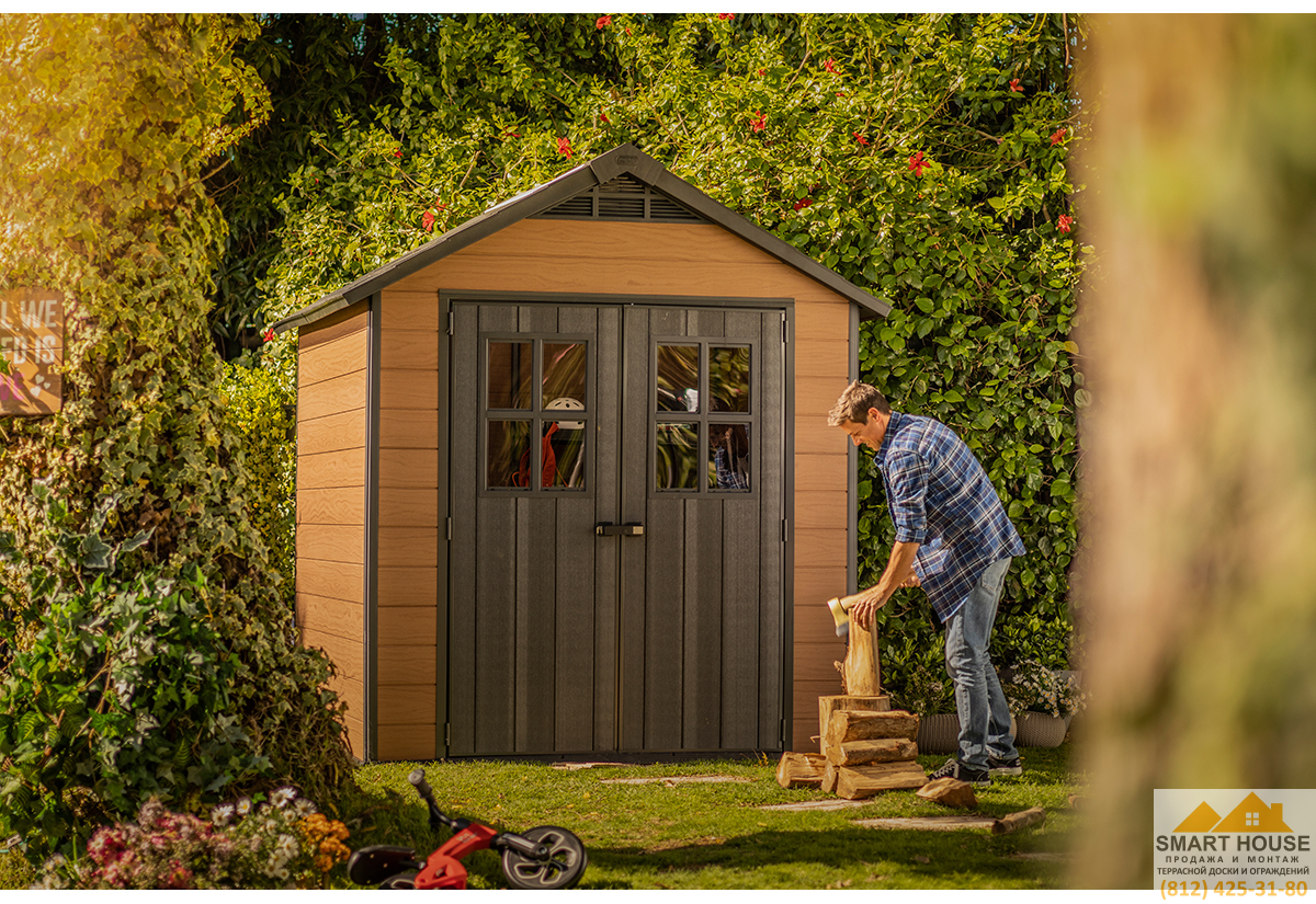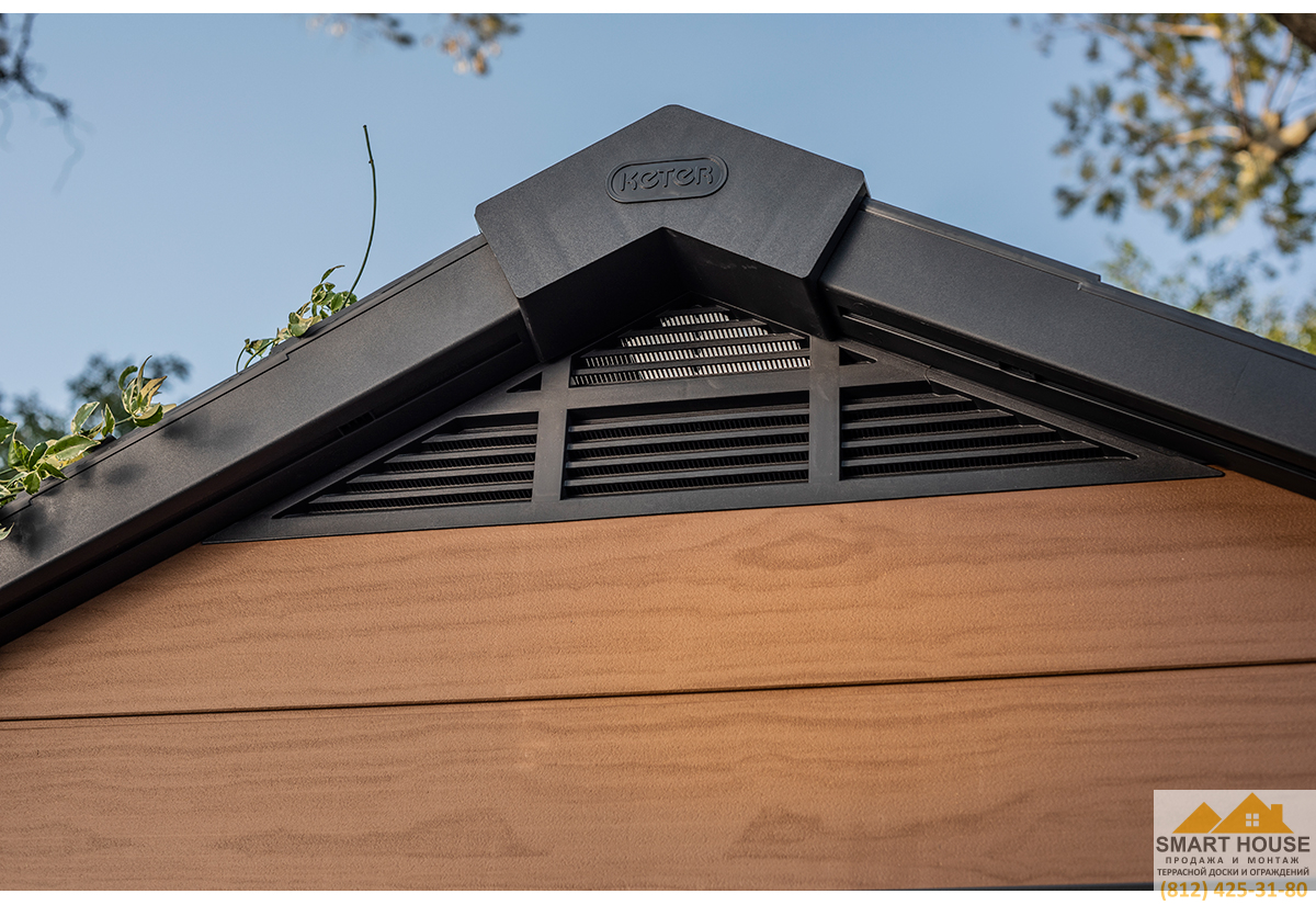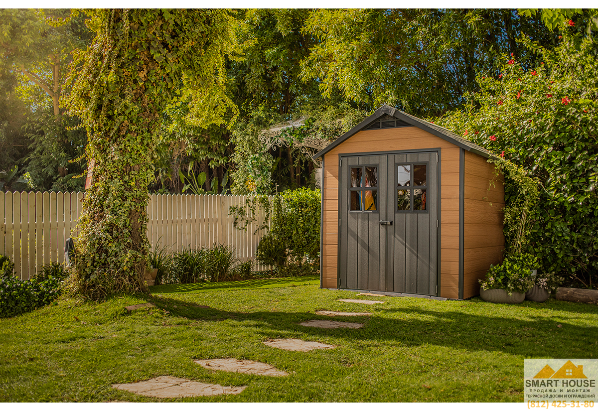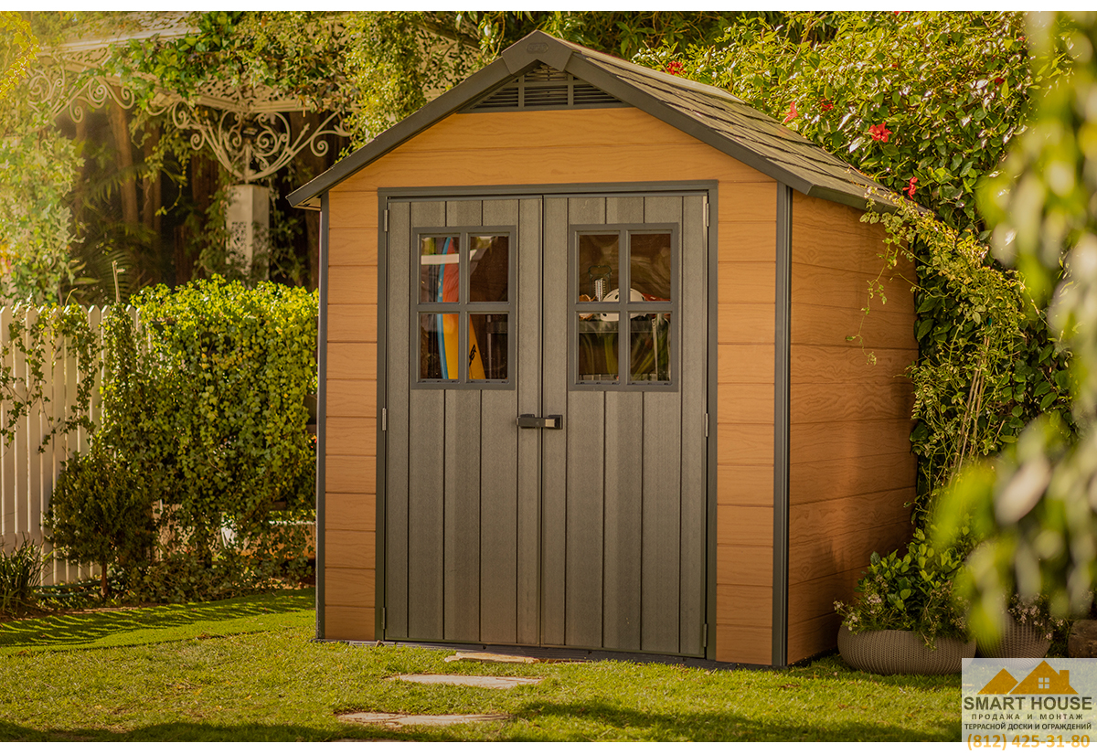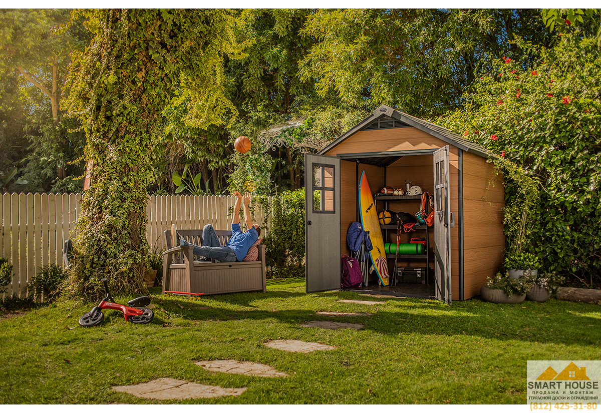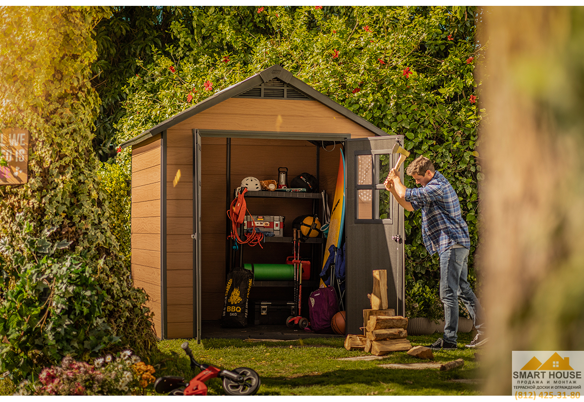 Пластиковый сарай Newton 757 поместится не только садовый инвентарь, а также инструменты и предметы, необходимые в домашнем хозяйстве. Изделие изготовлено из высококачественного пластика, поэтому не подвержено процессам коррозии,отслаивания покрытия или гниения материала. Благодаря всем этим преимуществом домик не требует технического обслуживания. Cтруктура поверхности поддерживается в деревенском стиле.