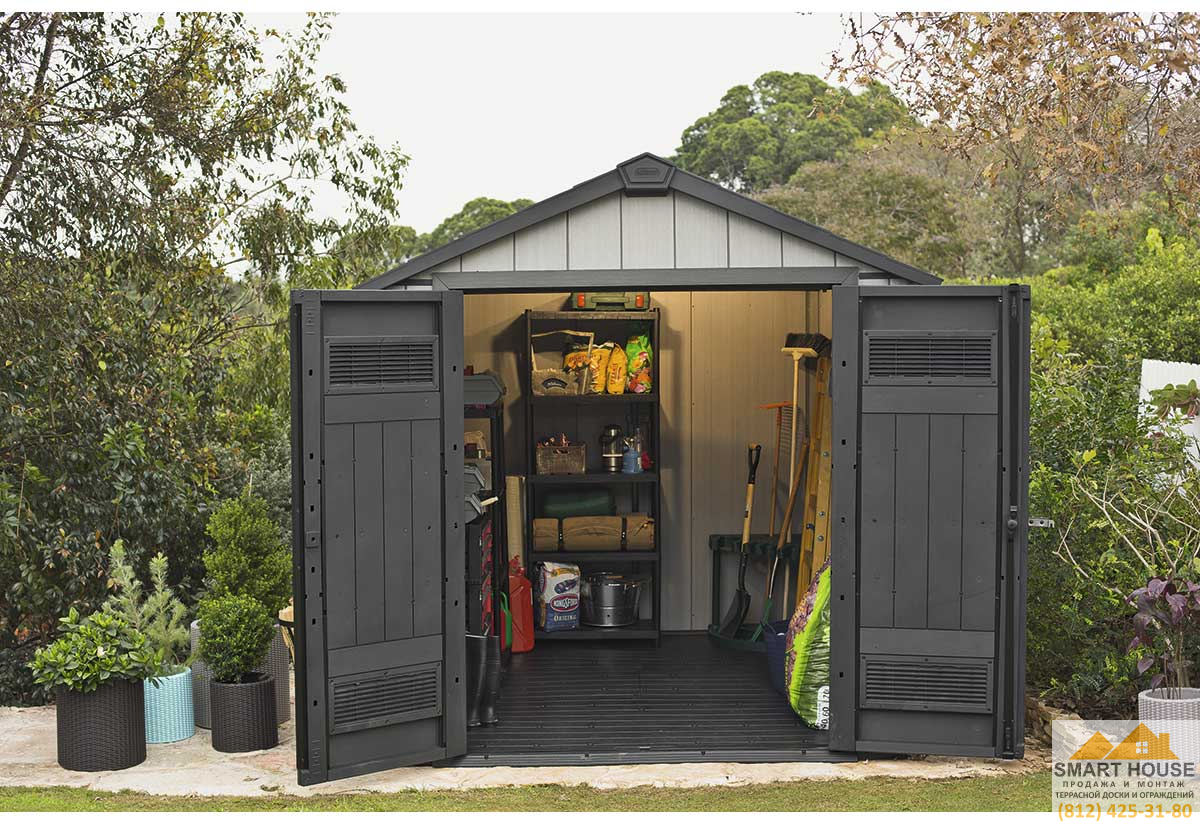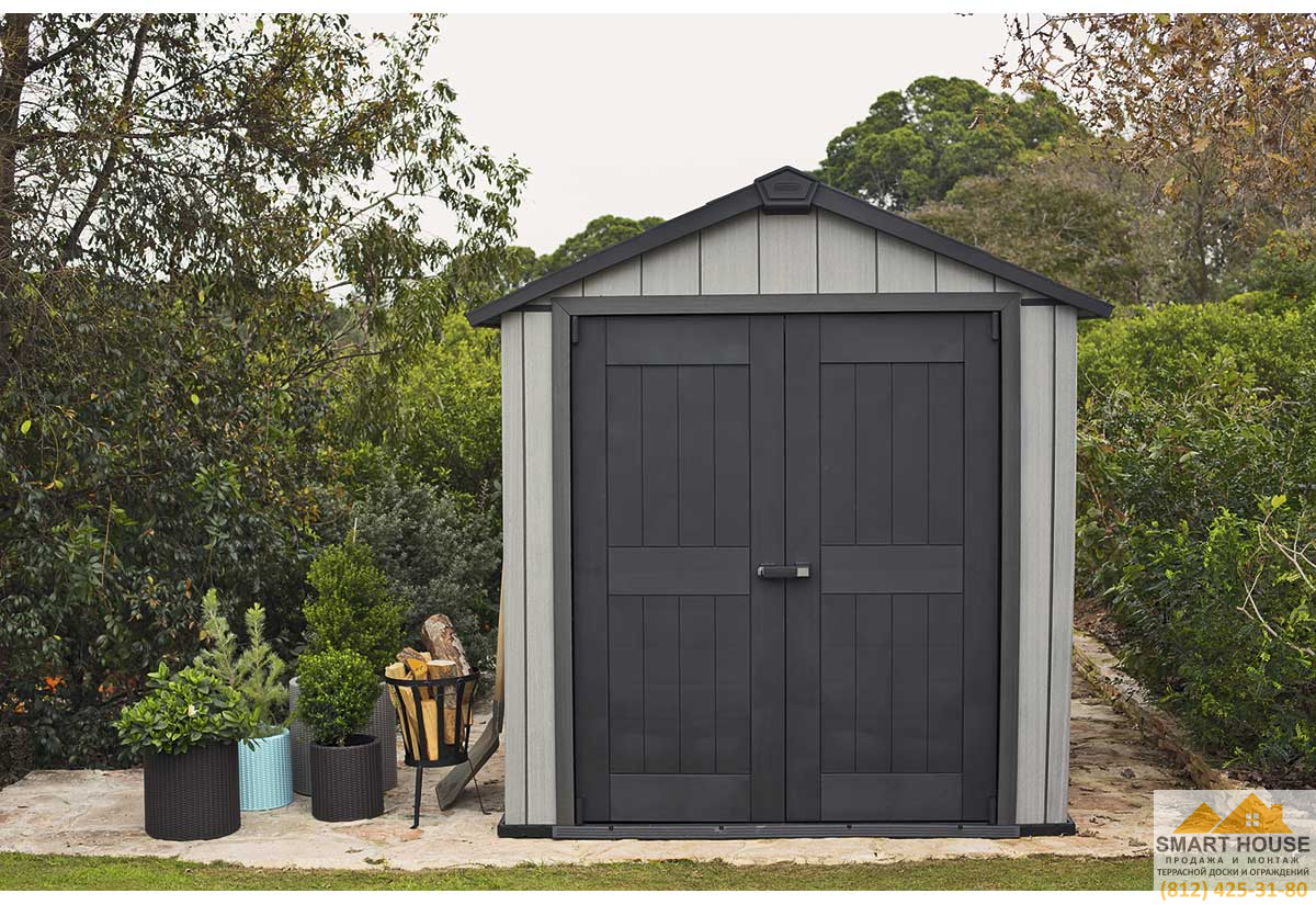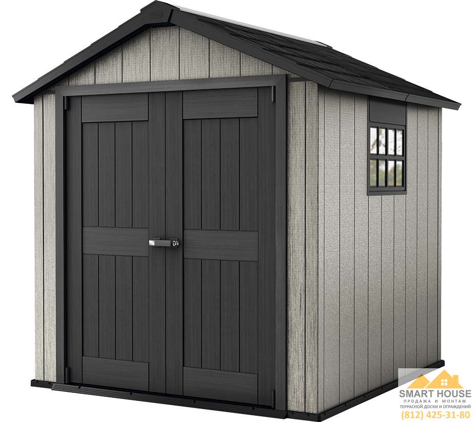 Пластиковый хозблок Oakland 757 изготовлен из уникальной композиции смол, составляющих в результате высококачественный материал, устойчивый к воздействию неблагоприятных внешних факторов. Сарай вместит в себя не только садовые инструменты и аксессуары, но также и газонокосилку и лестницу. Его основными преимуществами являются стабильная, усиленная металлом конструкция, солидная крыша и широкие, двустворчатые двери, а также то, что сарай можно покрасить в любой цвет в соответствии с индивидуальными пожеланиями. Стены сарая могут быть окрашены основанной на воде акриловой краской для внешнего использования, для этого рекомендуется использовать валик. Следует помнить, что окраска требует обслуживания и через какое-то время может потребоваться перекрашивание.