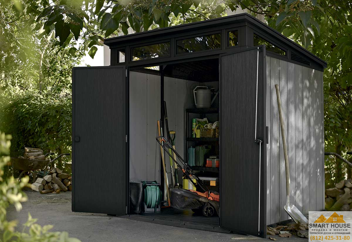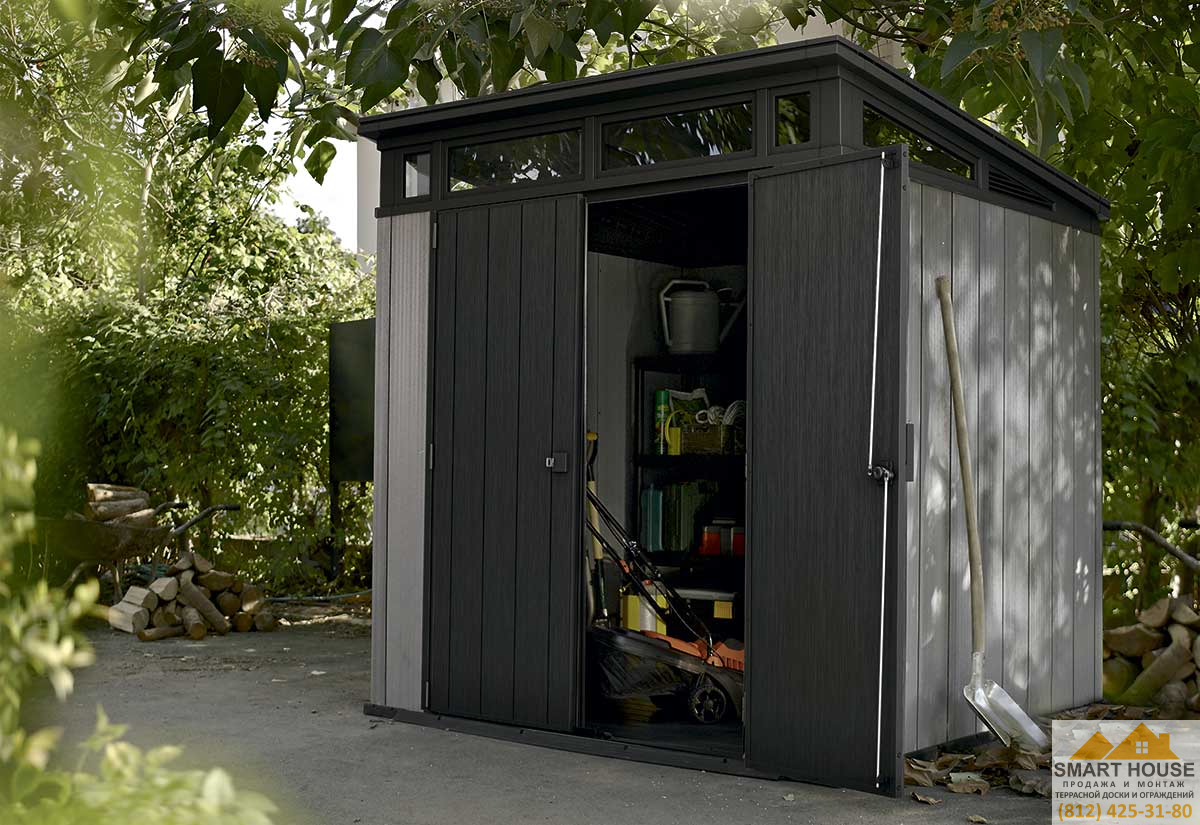 Сарай ARTISAN 7x7 - это ответ на запрос тех, кто ищет как современные, функциональные, так и стильные решения для своего сада. Обширное внутреннее пространство дает возможность установить в сарай шкафчики, вешалки и полки, а также хранить там крупные садовые инструменты и аксессуары. Двойные стеновые панели изготовлены из уникальной композиции смол, образующих высококачественный материал, стойкий к воздействию неблагоприятных внешних факторов. Солидная крыша и дополнительно усиленная металлом конструкция изделия обеспечивает долговечность и многолетнее успешное использование. Безусловным преимуществом также является возможность окраски сарая в выбранный Вами цвет. Стены сарая могут быть окрашены основанной на воде акриловой краской для внешнего использования, для этого рекомендуется использовать валик. Следует помнить, что окраска требует обслуживания и через какое-то время может потребоваться перекрашивание.