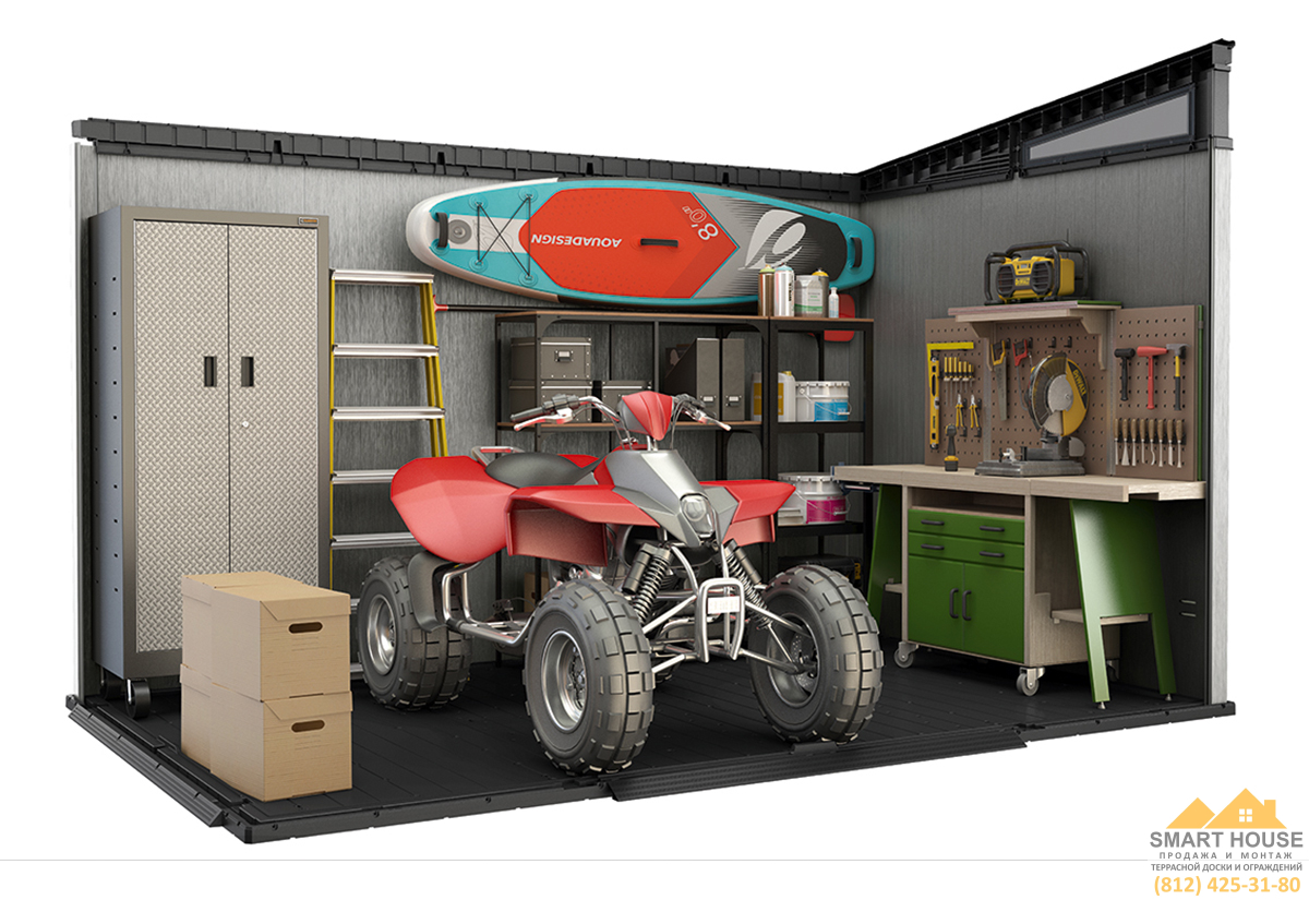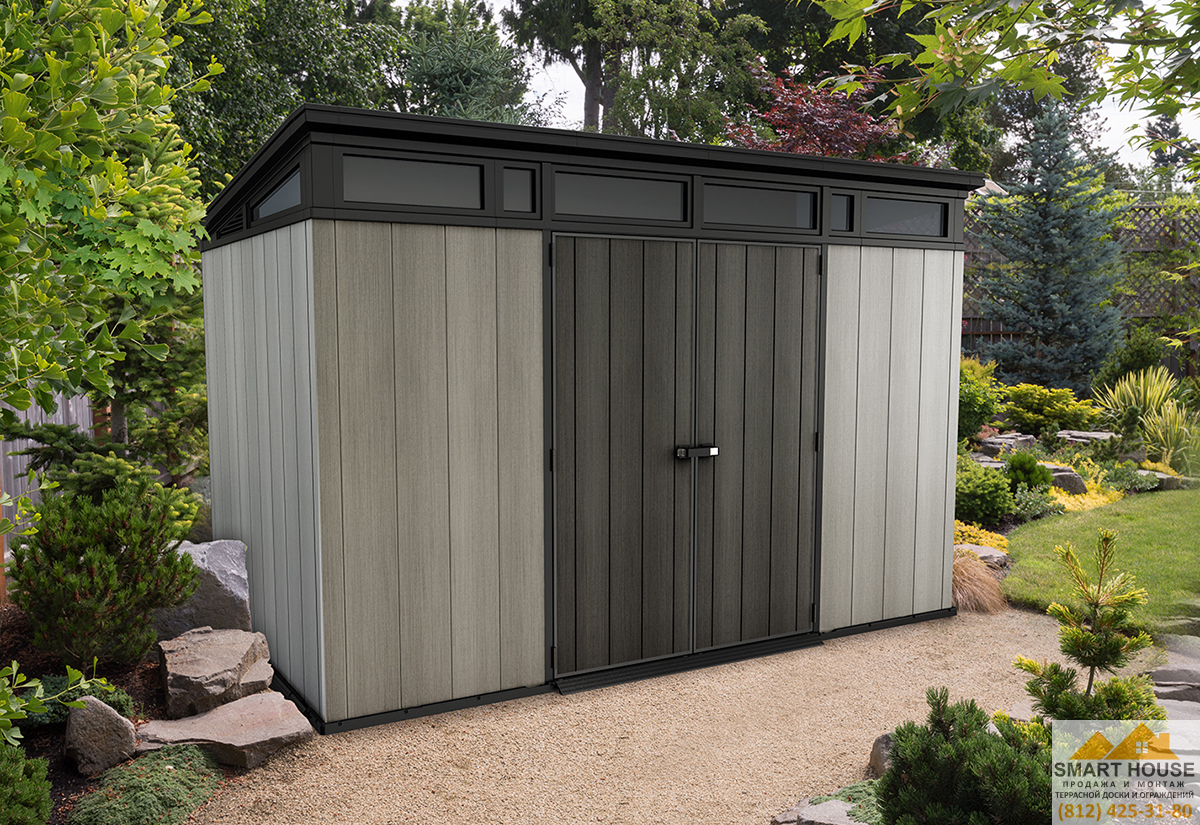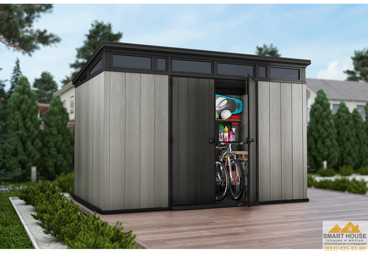 Исключительно просторный сарай ARTISAN 11х7 - это ответ на запрос тех, кто ищет как современные, функциональные, так и стильные решения для своего сада. Обширное внутреннее пространство дает возможность установить в сарай шкафчики, вешалки и полки, а также хранить там крупные садовые инструменты и аксессуары. Двойные стеновые панели изготовлены из уникальной композиции смол, образующих высококачественный материал, стойкий к воздействию неблагоприятных внешних факторов. Солидная крыша и дополнительно усиленная металлом конструкция изделия обеспечивает долговечность и многолетнее успешное использование. Безусловным преимуществом также является возможность окраски сарая в выбранный Вами цвет. Стены сарая могут быть окрашены основанной на воде акриловой краской для внешнего использования, для этого рекомендуется использовать валик. Следует помнить, что окраска требует обслуживания и через какое-то время может потребоваться перекрашивание.